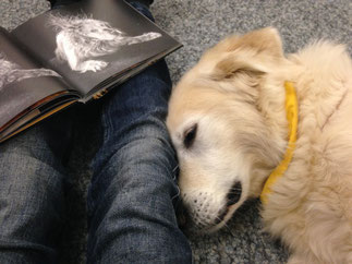 Seit Sommer 2014 ist Golden Retriever Mambo als Schulhund im Einsatz an der Oberstufe Sternmatt 2 und unterstützt mich in der Mediothek.