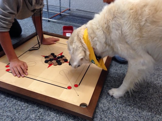 Ab und zu erhält Mambo eine aktive Aufgabe, bei der Interessierte mitmachen dürfen (z.B. dem Hund einen Futterbeutel verstecken, den dieser dann finden und bringen
