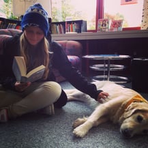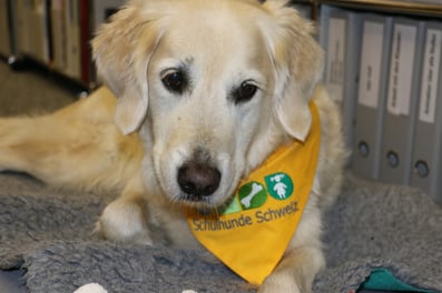 Seit Sommer 2014 ist Golden Retriever Mambo als Schulhund im Einsatz an der Oberstufe Sternmatt 2 und unterstützt mich in der Mediothek.