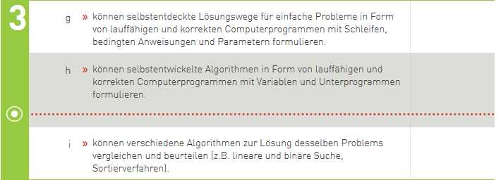 Die Schülerinnen und Schüler können einfache Problemstellungen analysieren, mögliche Lösungsverfahren beschreiben und in Programmen umsetzen.