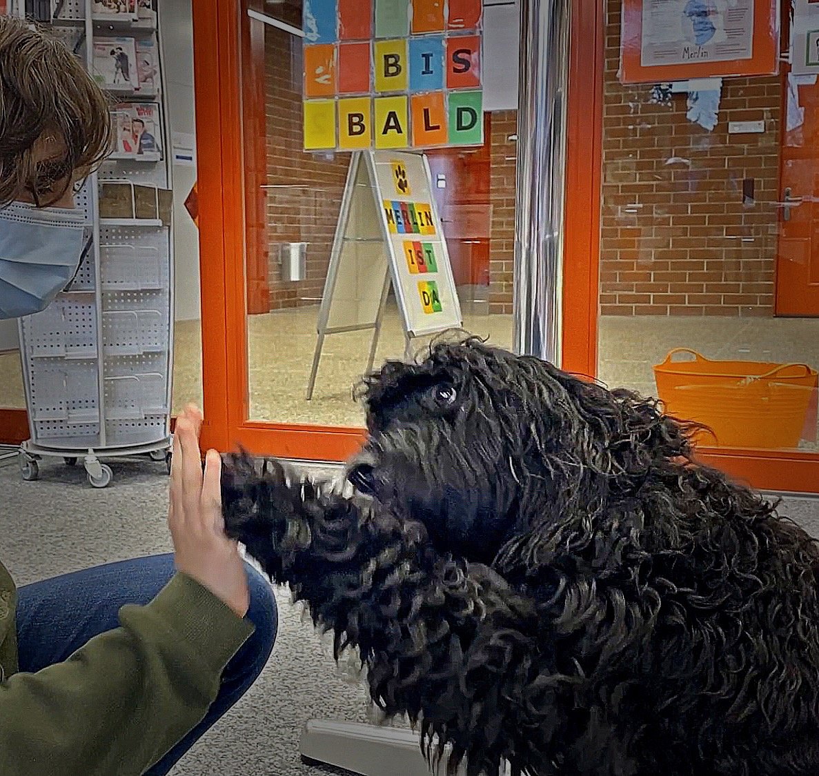 Gib Merlin noch Zeit und lasse ihn auf dich zukommen. Merlin ist noch klein und muss noch alles lernen. Seine Wünsche beschreiben, wie du dich richtig verhältst. An der Tafel vor der Mediothek kannst du immer sehen, ob Merlin da ist.