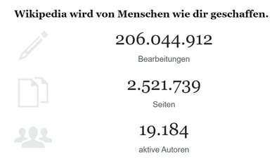Die 55.6 Millionen Einträge auf der Plattform (Stand Dezember 2020) in 294 aktiven Sprachen werden nämlich von Tausenden Freiwilliger ehrenamtlich erstellt. Die deutsche Sprachversion von Wikipedia ist mit 2.5 Millionen Artikeln eine der wichtigsten und liegt auf Rang 4.